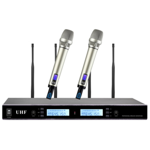 1、双通道分集式接收机;黑色金属面板,LED段码显示器,可同时显示群组、频率、电池电量、静音位准、电子音量等相关信息;